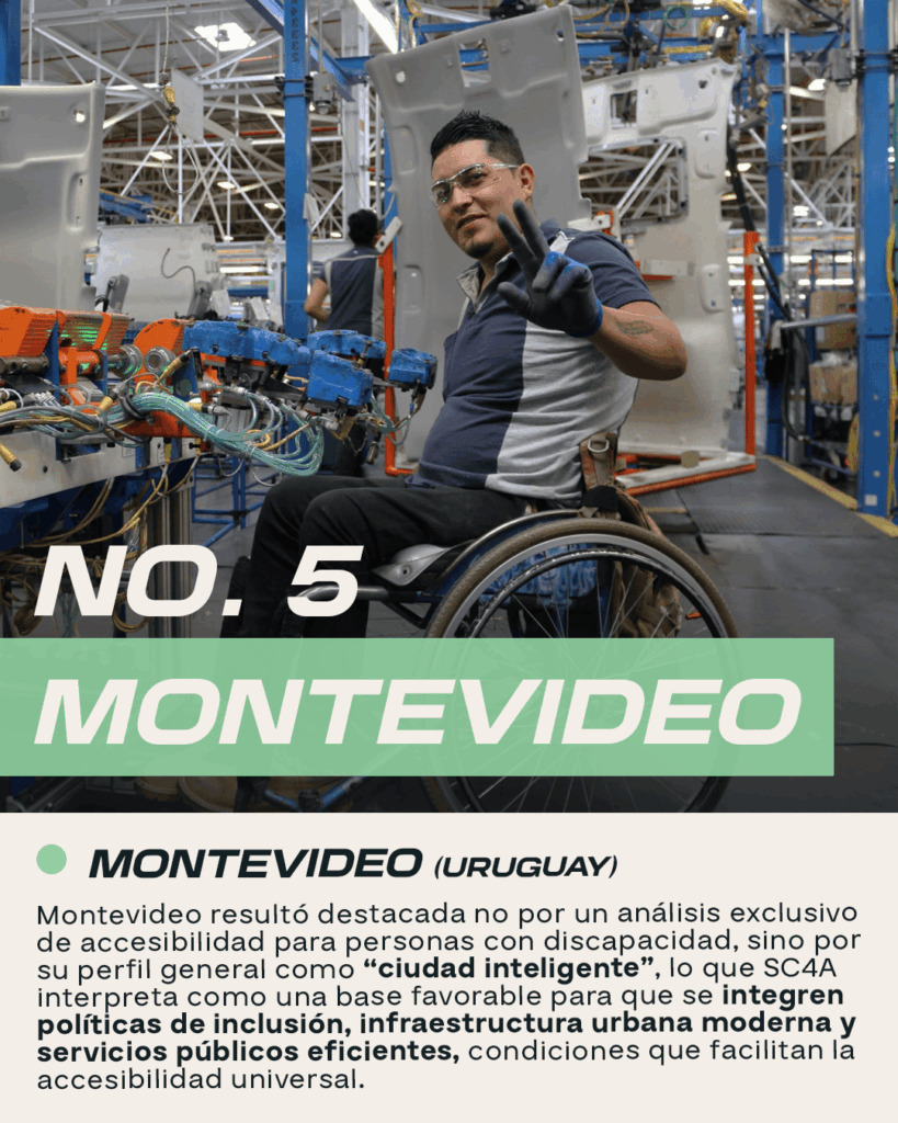 Montevideo resultó destacada no por un análisis exclusivo de accesibilidad para personas con discapacidad, sino por su perfil general como “ciudad inteligente” — lo que SC4A interpreta como una base favorable para que se integren políticas de inclusión, infraestructura urbana moderna y servicios públicos eficientes, condiciones que facilitan la accesibilidad universal.