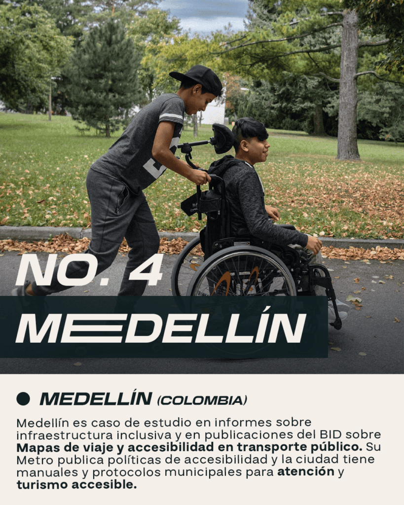 Medellín es caso de estudio en informes sobre infraestructura inclusiva (AT2030 / GDI Hub) y en publicaciones del BID sobre Mapas de viaje y accesibilidad en transporte público. Su Metro publica políticas de accesibilidad y la ciudad tiene manuales y protocolos municipales para atención y turismo accesible.