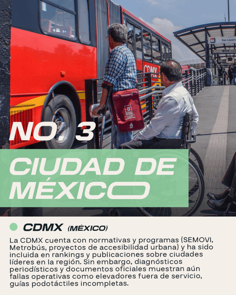 La CDMX cuenta con normativas y programas (SEMOVI, Metrobús, proyectos de accesibilidad urbana) y ha sido incluida en rankings y publicaciones sobre ciudades líderes en la región. Sin embargo, diagnósticos periodísticos y documentos oficiales muestran aún fallas operativas como elevadores fuera de servicio, guías podotáctiles incompletas.