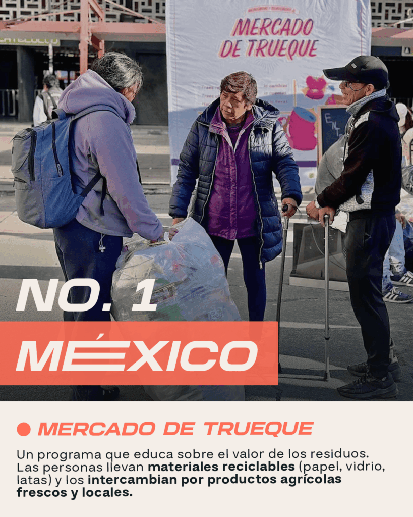 Un programa de educación ambiental donde las personas llevan residuos reciclables (papel, vidrio, cartón, latas, PET, etc.) y los intercambian por productos agrícolas como verduras, plantas o libros. Esto educa sobre el valor de los residuos y promueve el reciclaje en la comunidad.