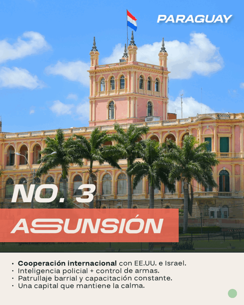 Con una tasa de homicidios de 6.8, Asunción combina estabilidad social con una política activa de combate al crimen organizado. El gobierno paraguayo impulsó alianzas con EE.UU. e Israel para fortalecer la inteligencia policial y la interdicción de armas y drogas, reduciendo los delitos transnacionales que antes impactaban en la seguridad local.