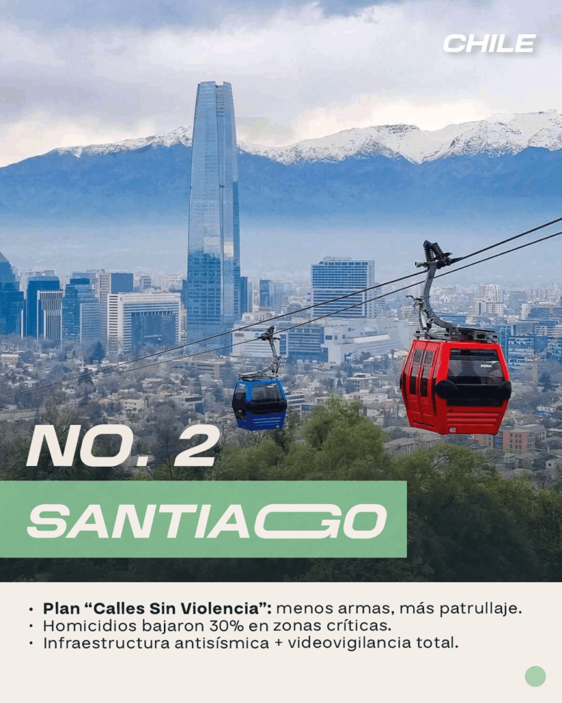 El resultado: una reducción cercana al 30% en homicidios en las comunas intervenidas. La capital chilena también destaca por su infraestructura antisísmica y una red de videovigilancia de última generación, que ha mejorado la respuesta ante emergencias urbanas.