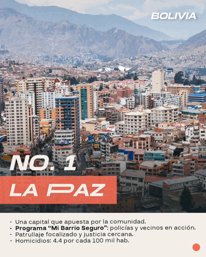Sorprendentemente, la capital administrativa de Bolivia se ha convertido en una de las ciudades más seguras de Sudamérica. Con una tasa de homicidios de 4.4 por cada 100,000 habitantes, La Paz ha reforzado la cercanía entre policía y comunidad con su programa “Mi barrio seguro”.