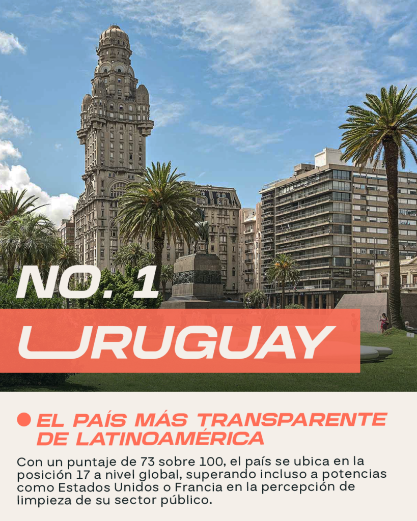 Por tercer año consecutivo, Uruguay se consolidó como el líder indiscutible en transparencia en Latinoamérica. Con un puntaje de 73 sobre 100, el país rioplatense se ubica en la posición 17 a nivel global, superando incluso a potencias como Estados Unidos o Francia en la percepción de limpieza de su sector público.